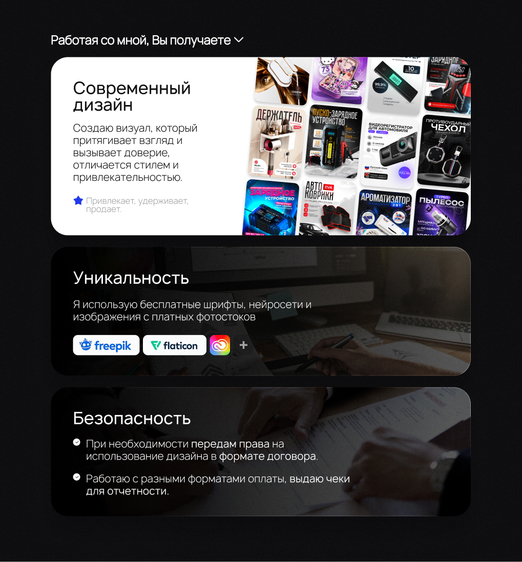 Портфолио, полезные материалы, прайс-лист, детали сотрудничества.